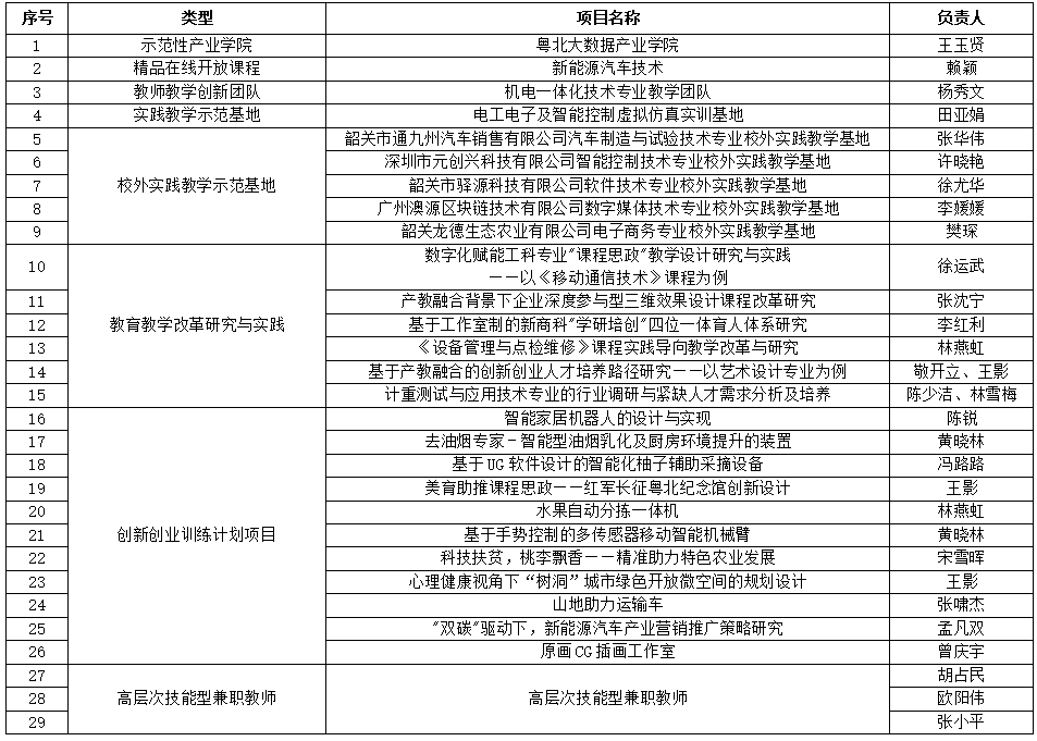 我校粤北大数据产业学院、精品在线开放课程《新能源汽车技术》、机电一体化技术专业教学团队、电工电子及智能控制虚拟仿真实训基地、5个校外实践教学基地、6项教育教学改革研究项目、11项创新创业训练计划项目、3位高层次技能型兼职教师获得省级认定或立项。