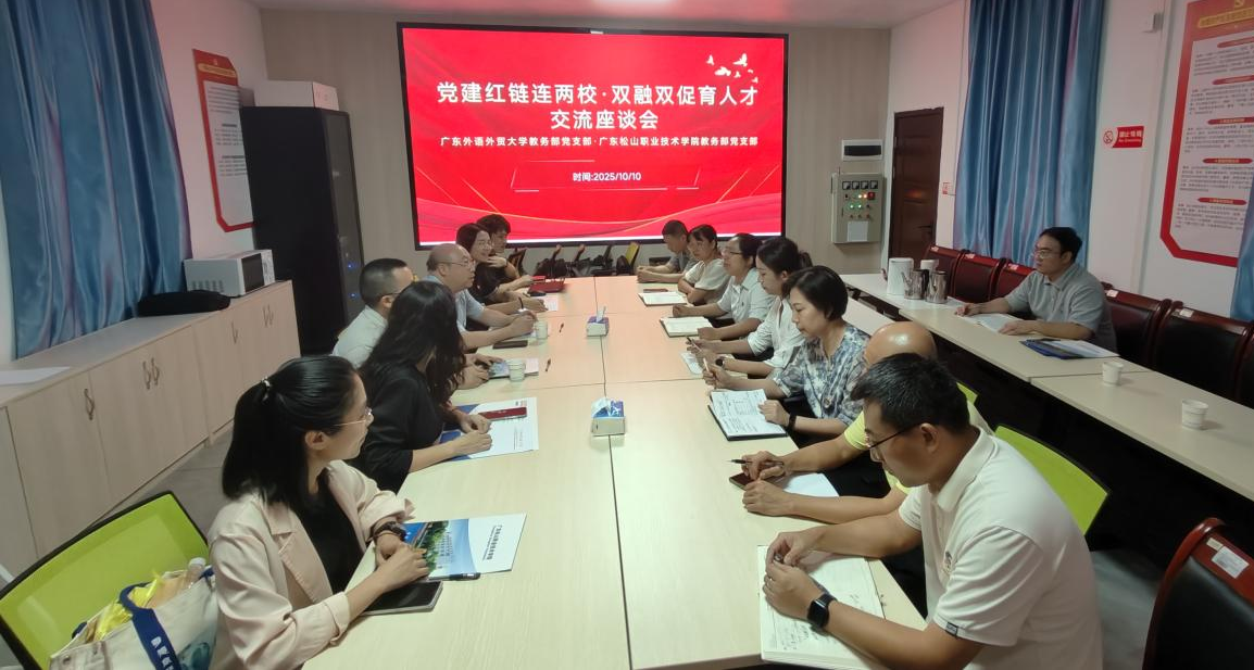 10月10日,广东外语外贸大学教务部党支部与我校教务部党支部在曲江校区开展“党建红链连两校·双融双促育人才”联合主题党日活动。双方围绕党建引领教学管理、服务学校高质量发展主题,开展实地考察与深入交流,进一步推动党建与业务深度融合、同向发力,共同擘画高质量发展新画卷。教务部全体党员、教职工参加此次活动。